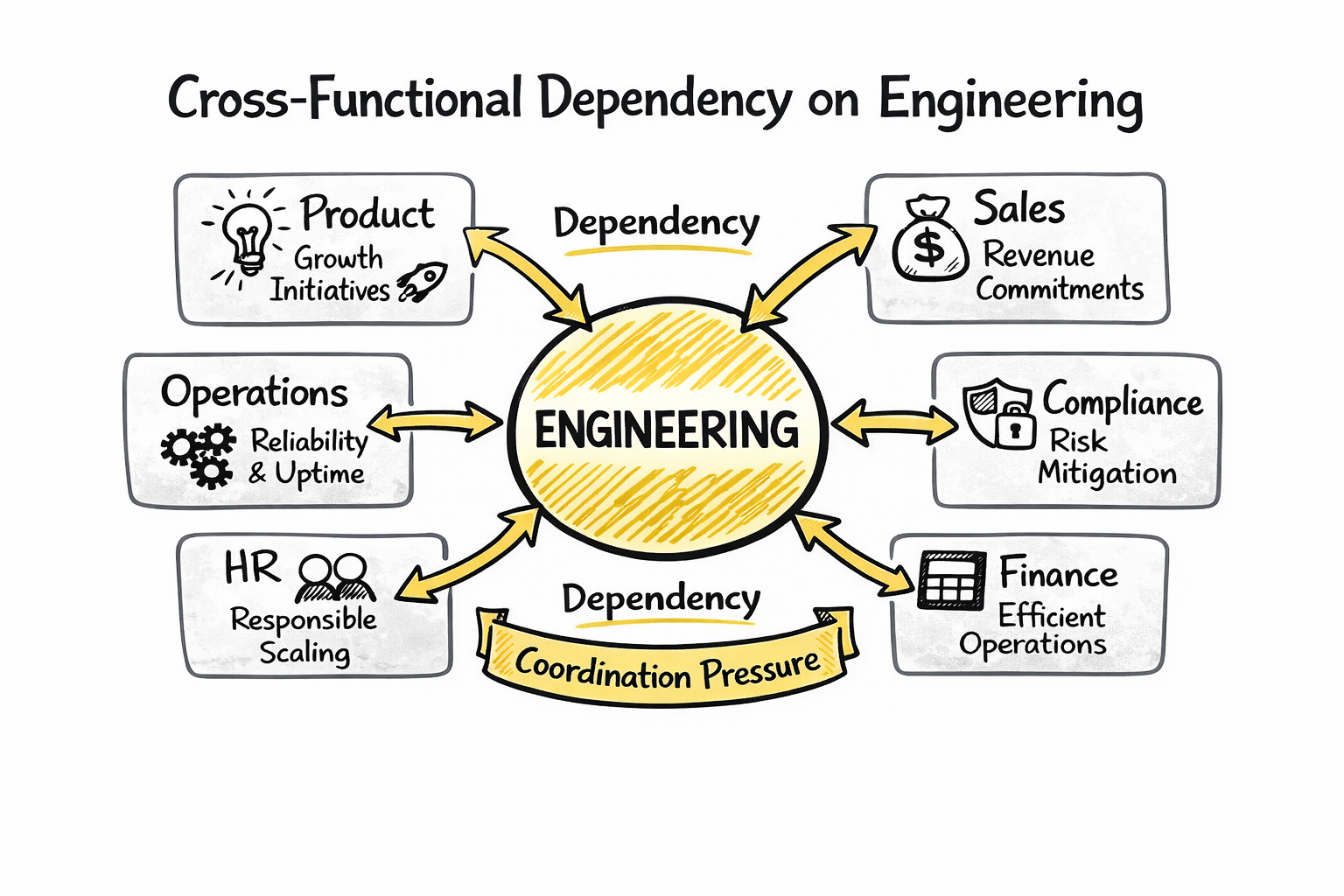 The dependency of multiple functions on engineering does not inherently create dysfunction. However, it does create a system in which engineering leaders must continuously reconcile competing priorities within finite capacity constraints.