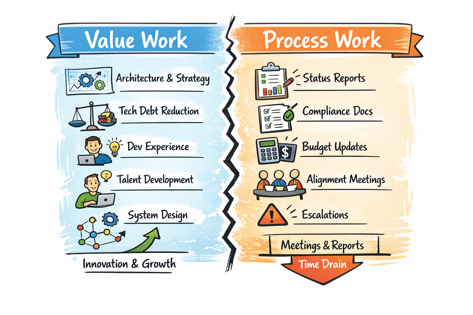 The organization continues operating, but its engineering foundation weakens. In engineering leadership, process overload does not merely consume time; it reduces strategic depth.